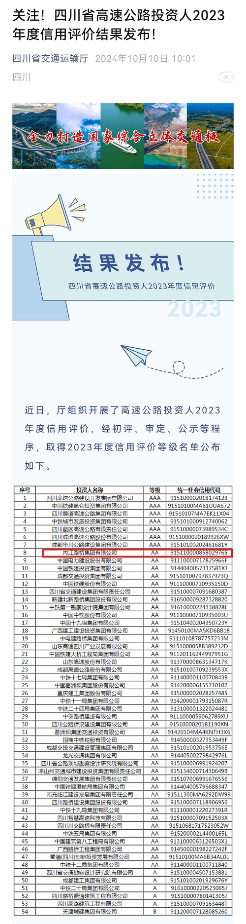 10月10日,四川省交通運(yùn)輸廳正式發(fā)布公告,內(nèi)江路橋集團(tuán)有限公司(以下簡稱“內(nèi)江路橋集團(tuán)”)成為內(nèi)江市唯一獲評四川省高速公路投資人2023年度信用評價等級AA級企業(yè)。這是繼2020年首次獲評該等級后,連續(xù)第四年蟬聯(lián)AA等級。